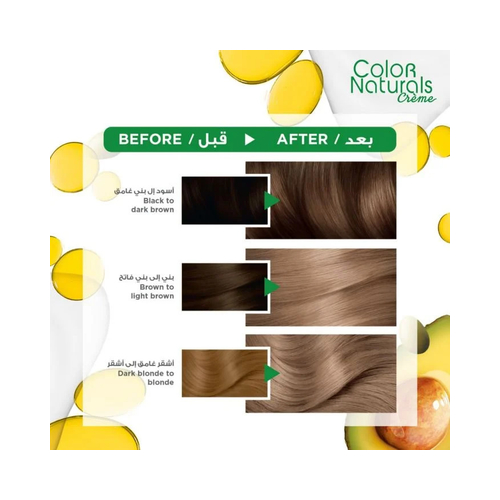 تمنحك صبغة كولور ناتشورالز من غارنييه لونًا طبيعيًا يدوم طويلاً، مع لمعان غني ومظهر حيوي. تتميز بتركيبة مغذية تحتوي على زيوت طبيعية من الكاريتي، الأفوكادو، وزيت الزيتون. توفر تغطية كاملة للشعر الأبيض بنسبة 100%.